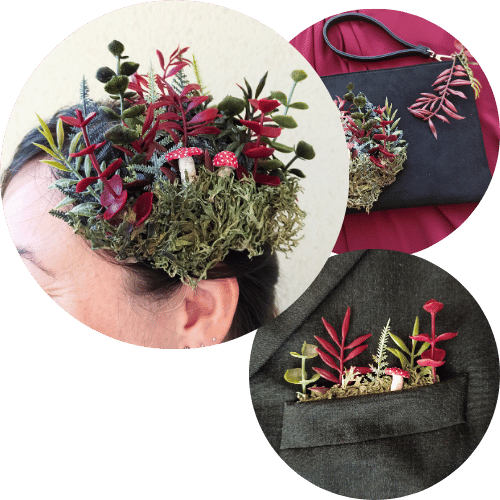 A lo largo de mi vida he desarrollado el arte de muchas formas: fabricando mis propios títeres de pequeña; dibujando y pintando lo que quería no olvidar; maquillando y creando escenografías teatrales y audiovisuales; cosiendo ropa y accesorios para mí o mis muñecas; transformando y aprovechando materiales a través del upcycling… Con el tiempo parte de esa creatividad se canalizó en crear mis propios tocados para celebraciones importantes.